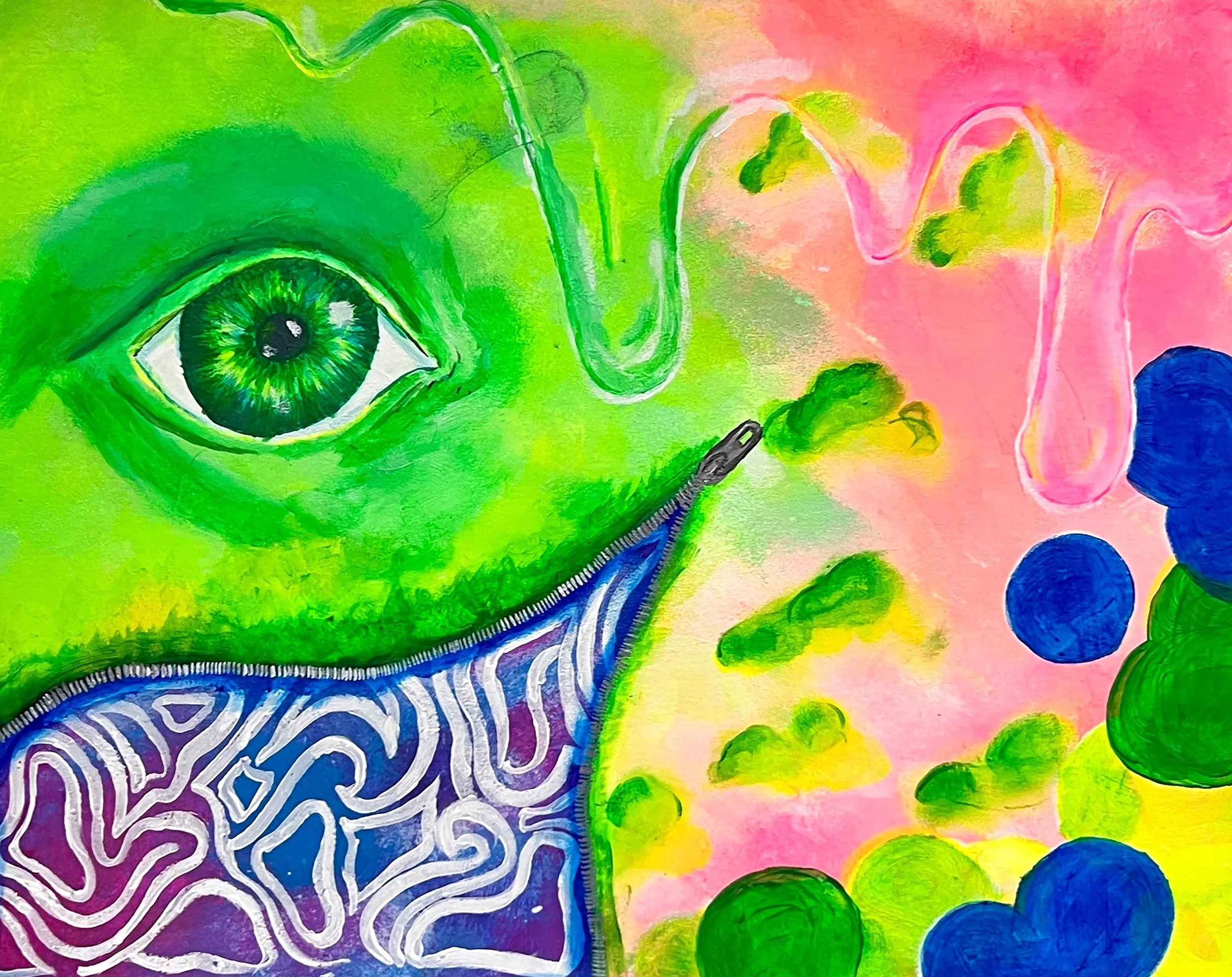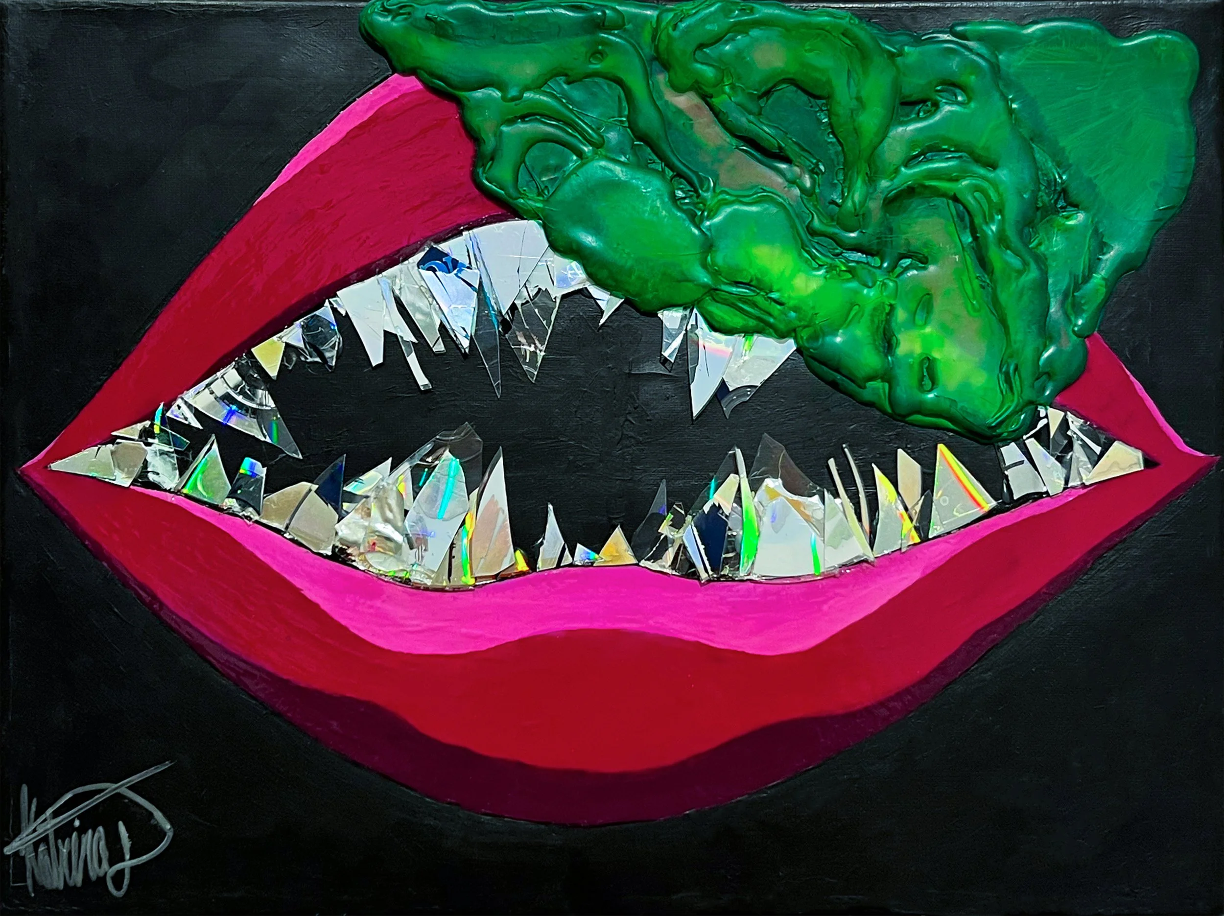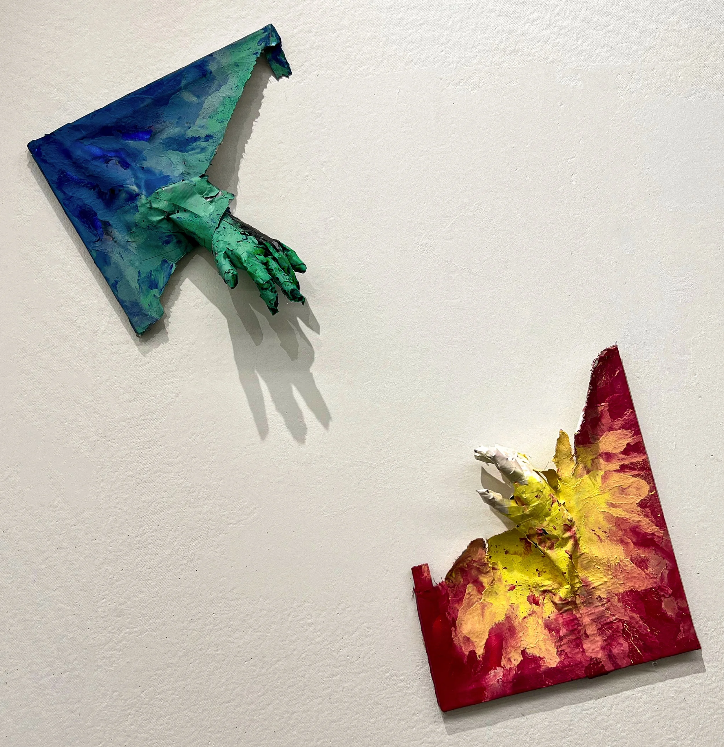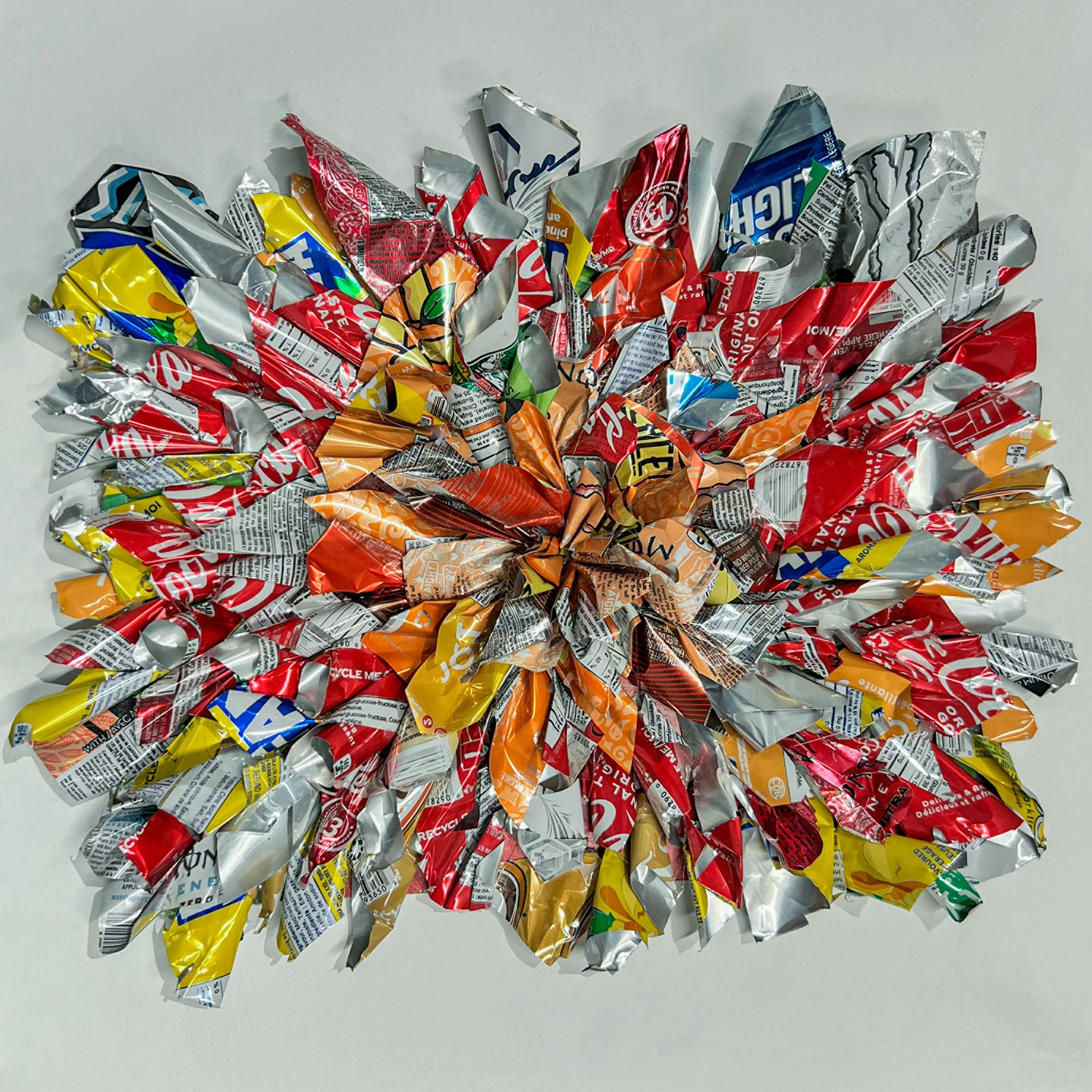 Pop cans, empty paint tubes, wire, discarded canvas paper, acrylic, gloss medium on masonite board.