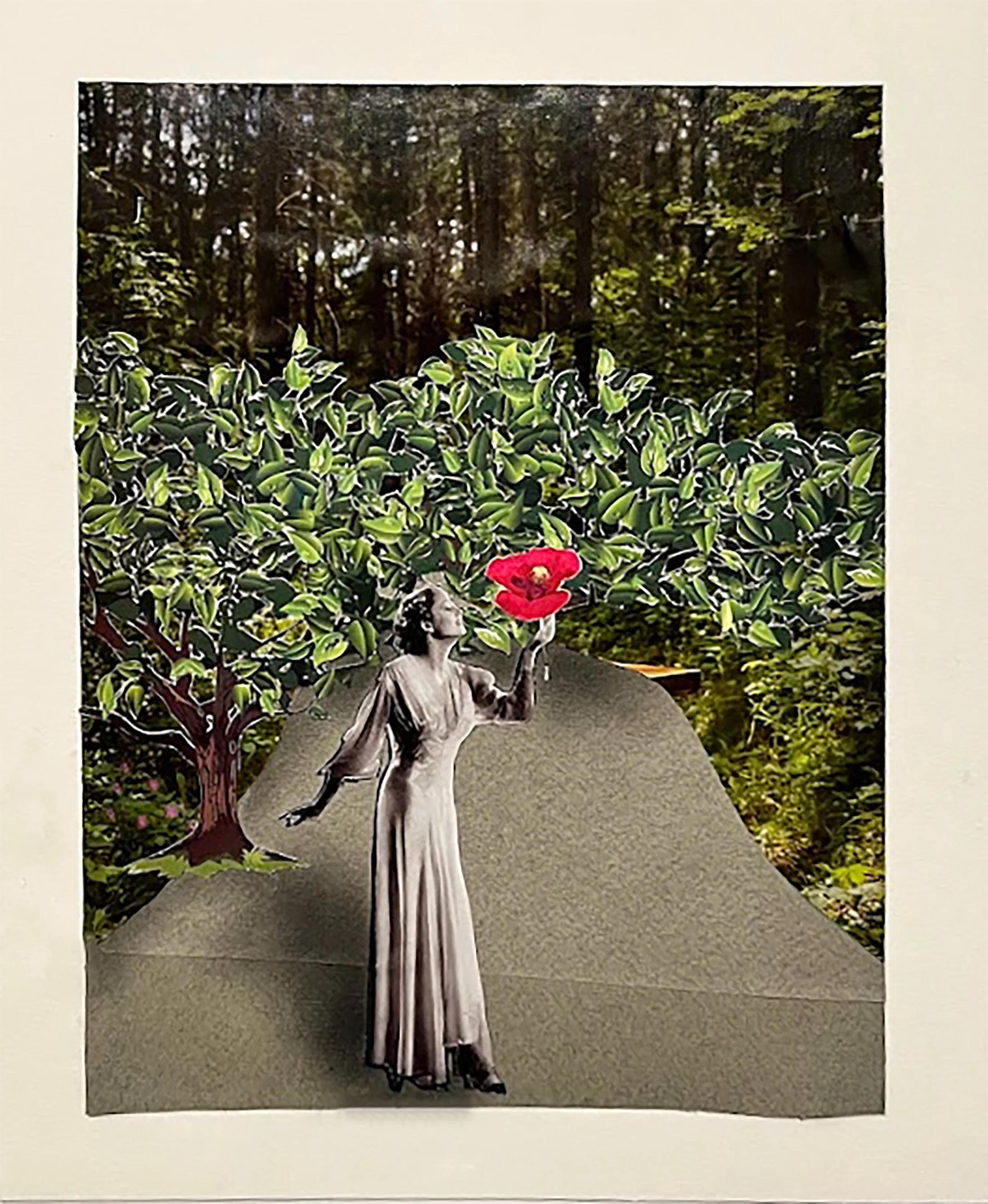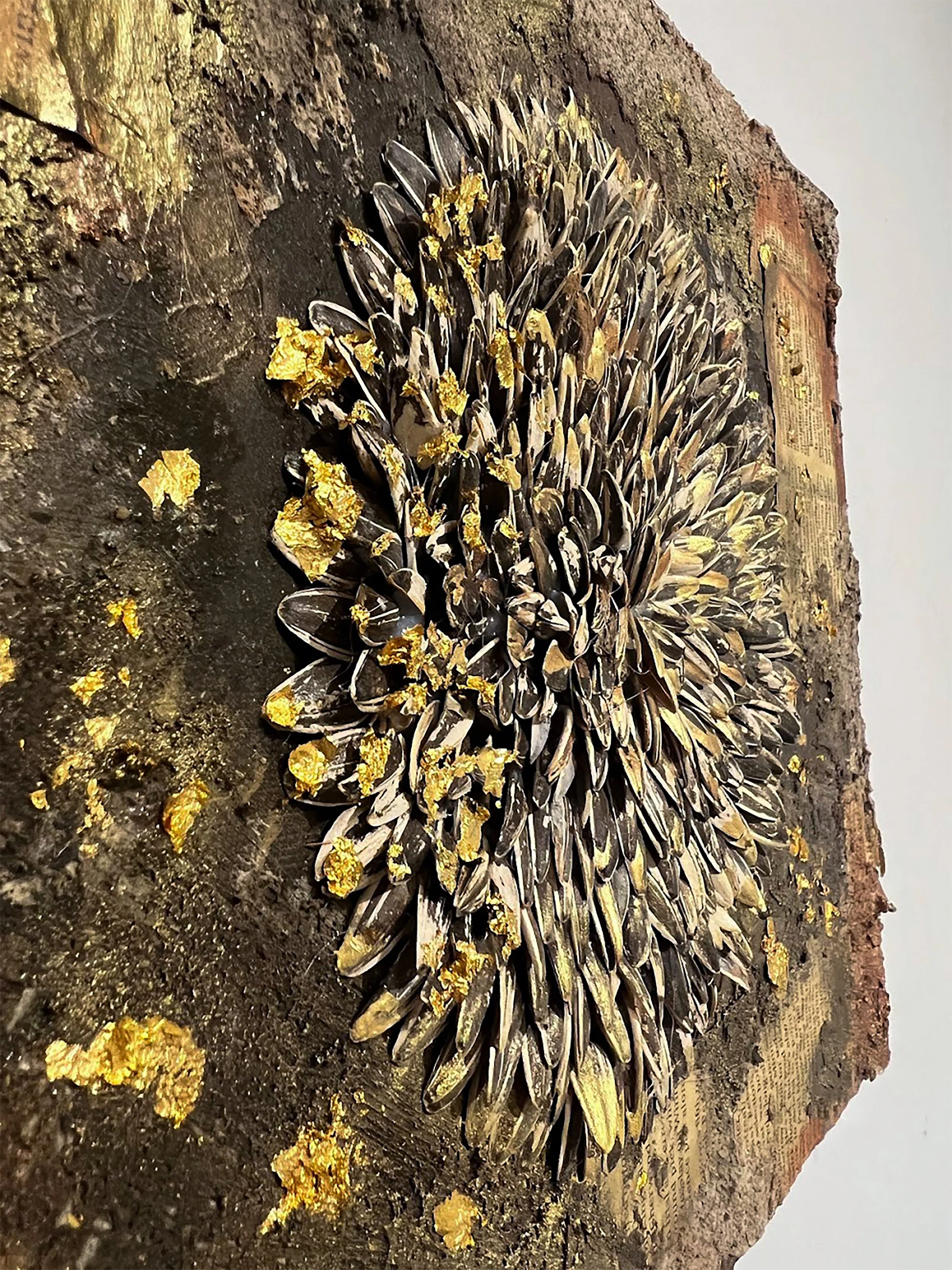 Sunflower seed shells, tea stained news paper, acrylic, textured medium, sand, gold leaf